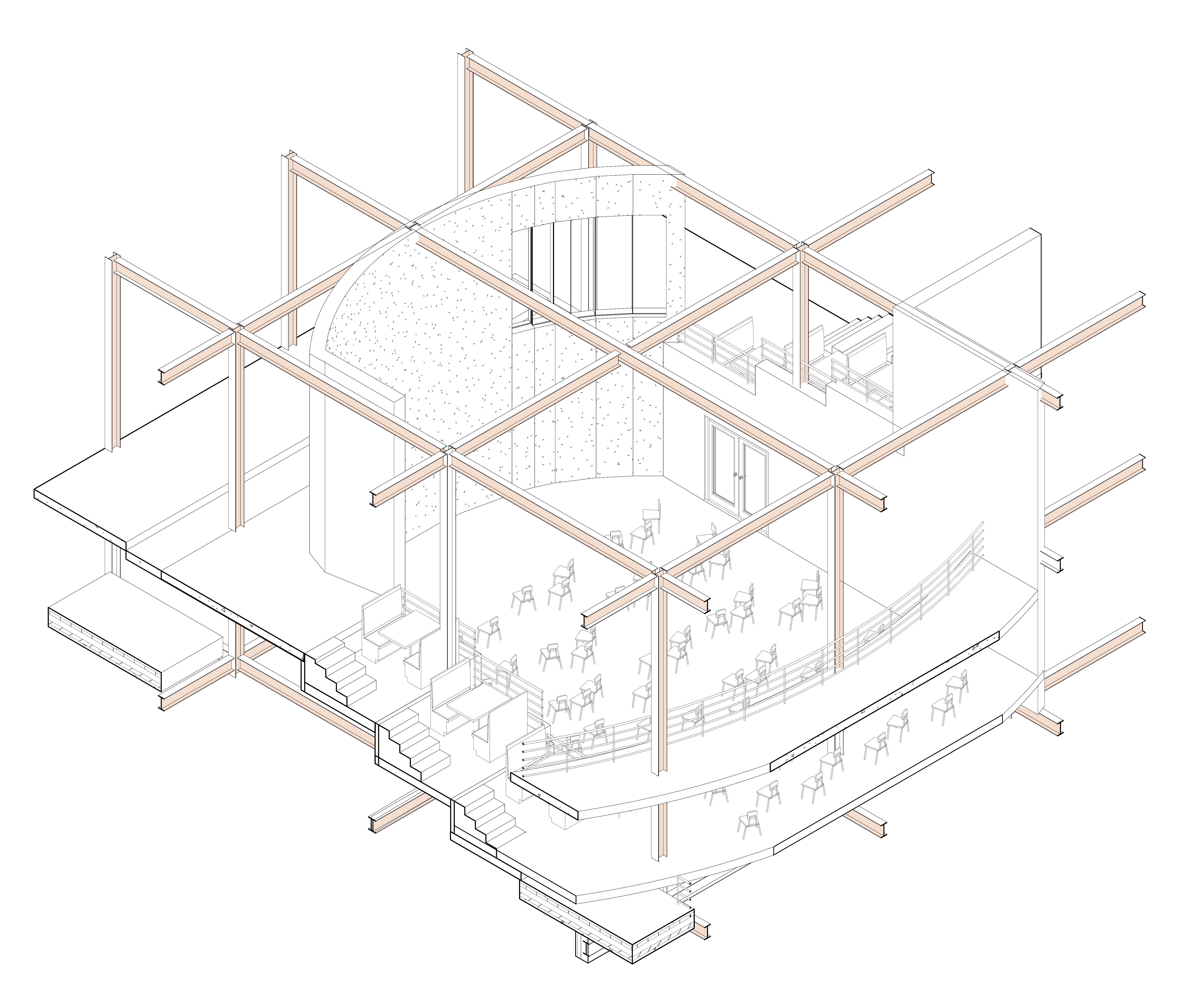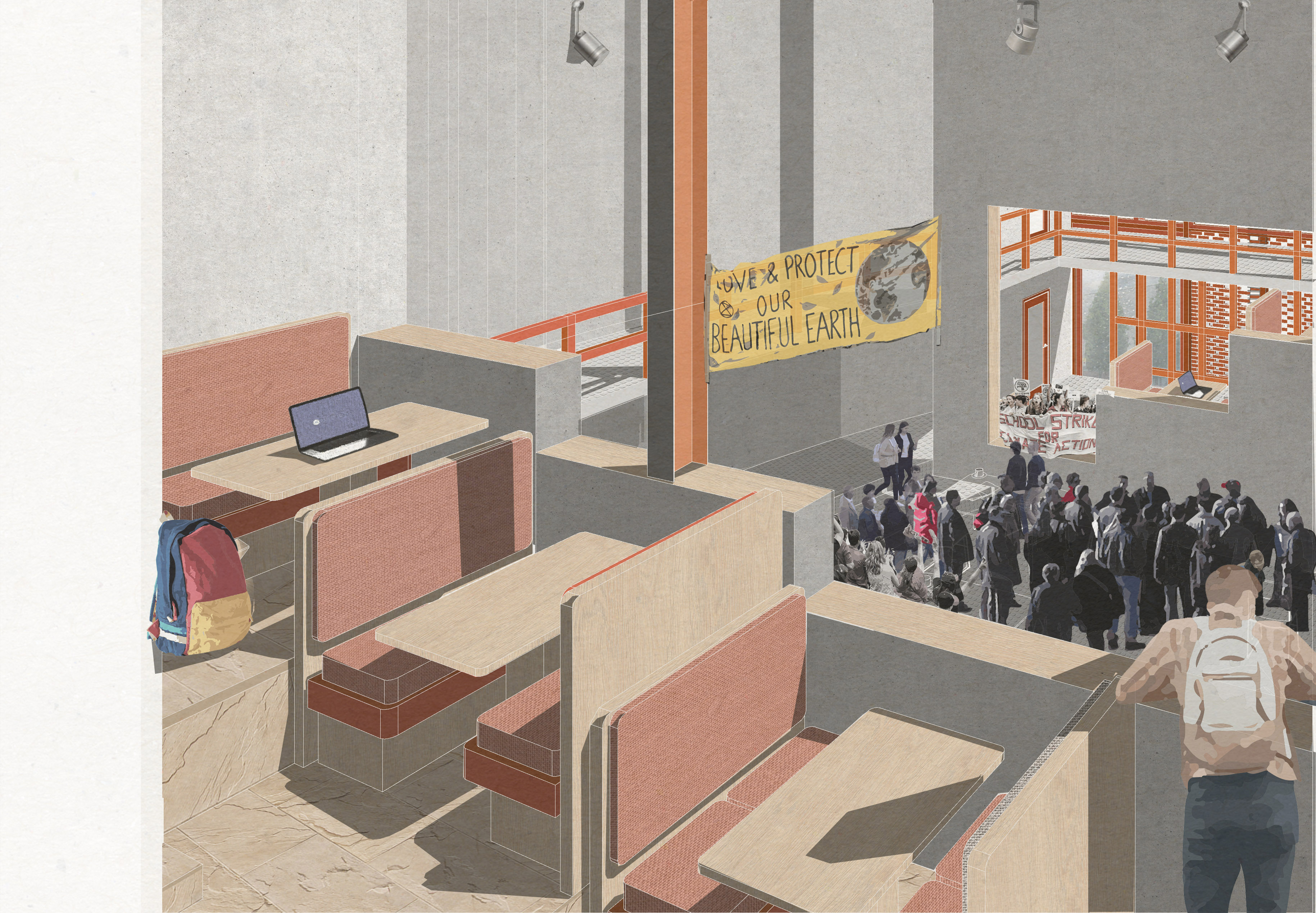 I wanted to rethink the commonplace idea that it is simply an enclosed space in which ideas are disseminated. Rather, it is a permeable space that is flexible enough to accommodate different types of group learning, be it a class, study sessions or debates. I drew influence from the structure of the university in which debate always followed a class, a system that prioritised individual expression within the collective.